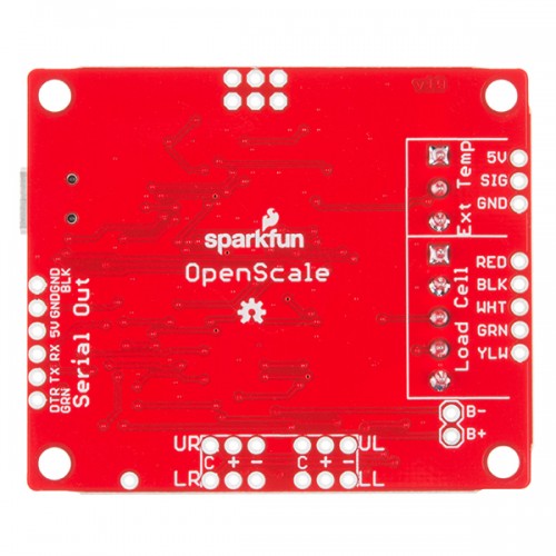 On board the SparkFun OpenScale is the ATmega328P microcontroller, for addressing your communications needs and transferring your data to a serial terminal or to a data logger such as the OpenLog, an FT231 with mini USB, for USB to serial connection; the HX711, a 24-bit ADC for weigh scales; and the TMP102, for recording the ambient temperature of your system. The OpenScale communicates at a TTL level of 9,600bps 8-N-1 by default and possesses a baud rate configurable from 1,200bps to 1,000,000bps.
